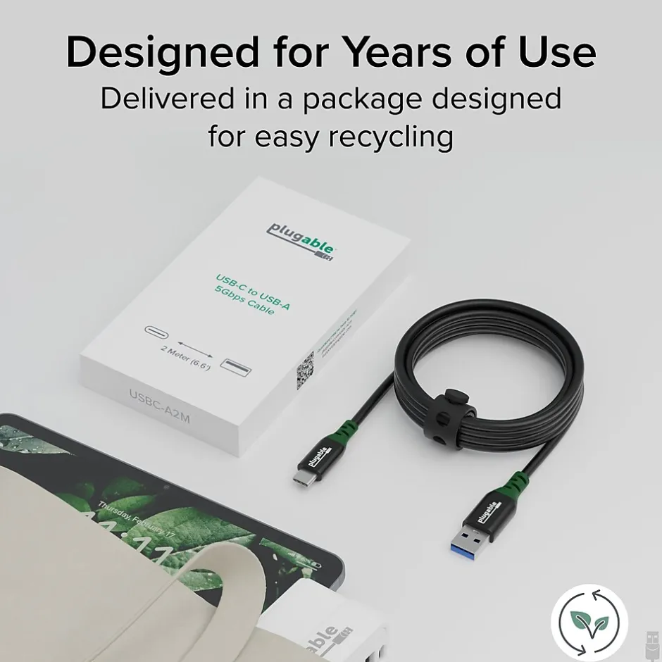 The Plugable USB-C to USB-A 6ft (2M) Cable (USBC-A2M) is the standard for professional-grade connectivity. But how important is a “professional grade” cord? More than you might think. Connecting two devices is only as efficient as the weakest link in the chain. A low-quality cable will severely limit compatibility, the flow of data, and power between the linked devices. Even something as simple as charging your phone can be slowed by a low-quality cable. That’s where the USBC-A2M stands out from the crowd. The USBC-A2M is designed to bridge the gap between modern technology and legacy ports. This 6ft cable offers the length required for flexible setups. With transfer speeds up to 5Gbps (USB 3.2 Gen 1), you can expect reliable data transfer and charging.This M/M USB cable has been engineered for universal connectivity. It seamlessly connects the latest Thunderbolt, USB4, and USB-C-equipped smartphones, tablets, and laptops to older USB-A ports. Its durable design and integrated cable management mean it’ll withstand the wear and tear of the commute, and its sustainable packaging means the cord will last for years, not the box.