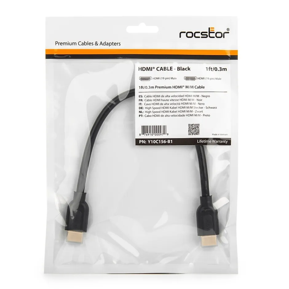 Rocstor’s 1ft Premium High Speed HDMI Cable with Ethernet is designed to deliver the maximum high definition experience to your HDTV. Designed with the highest Gold plated connector quality, this cable is designed to connect cable boxes, satellite receivers, Blu-ray players, streaming devices, computers, projectors, and game consoles to your flat panel TV. Rocstor HDMI® cable is designed to support today’s advanced electronics utilizing High Speed (category 2) HDMI with Ethernet. It supports up to 10.2 Gbps bandwidth with a 340 MHz refresh rate. You will experience a crisp and clear picture with no lag time on any of our digital video equipment. Experience full 1080p resolutions. Backwards compatible with all previous versions, it supports today’s 3D capable devices for a true movie theater experience. High-Definition Multimedia Interface (HDMI) enables the delivery of both high-definition video and multichannel, digital audio quality through just one cable. Rocstor’s HDMI® Audio Video Cables deliver the richest possible HD video and digital audio experience to your home theater. Use your Rocstor premium cable Worry free which is backed by Lifetime Limited Warranty.