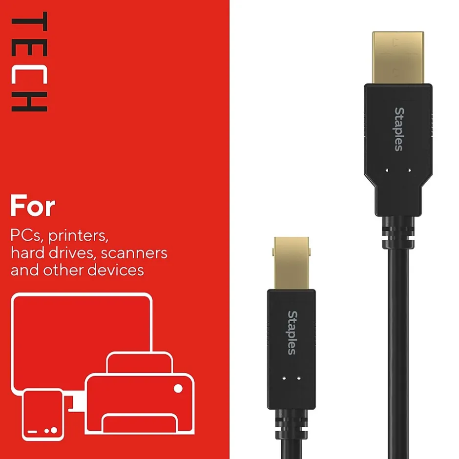 Connect peripheral devices like printers, copiers, external drivers and more with the Staples TECH USB-A to USB-C cable. The 16-foot cord offers ample length to connect devices across your work space, and the USB 2.0 boasts fast data transfer speeds up to 480 Mbps. Keep your workday running smoothly with the Staples TECH USB-A to USB-B cable. Backed by Staples Brands 100% satisfaction guarantee, or your money back.