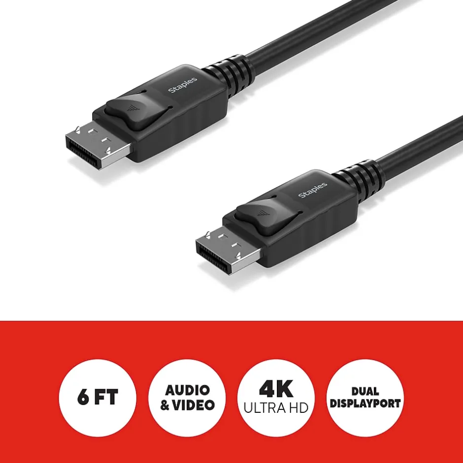For work or entertainment an extra display often comes in handy. With the Staples TECH DisplayPort cable, you can connect additional monitors, displays, gaming consoles, projectors and more. Delivering crisp 4K Ultra HD resolution this cable promises clear audio and video for an exceptional experience. The compact 6-foot cord, provides ample length to connect devices across your work space while also reducing cord clutter. This cable is the perfect choice for outfitting your work, gaming or entertainment space. Enjoy high resolution audio and video so you can upgrade your home or office workspace and do your best work. Backed by Staples Brands 100% satisfaction guarantee, or your money back.