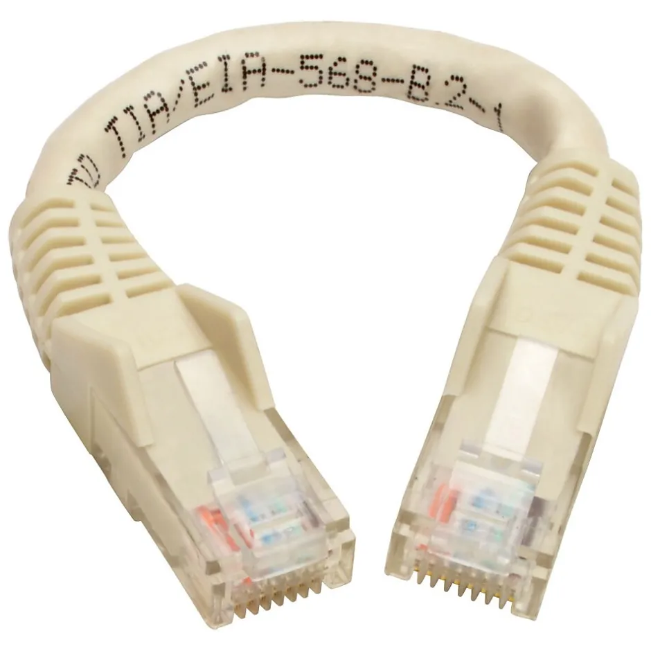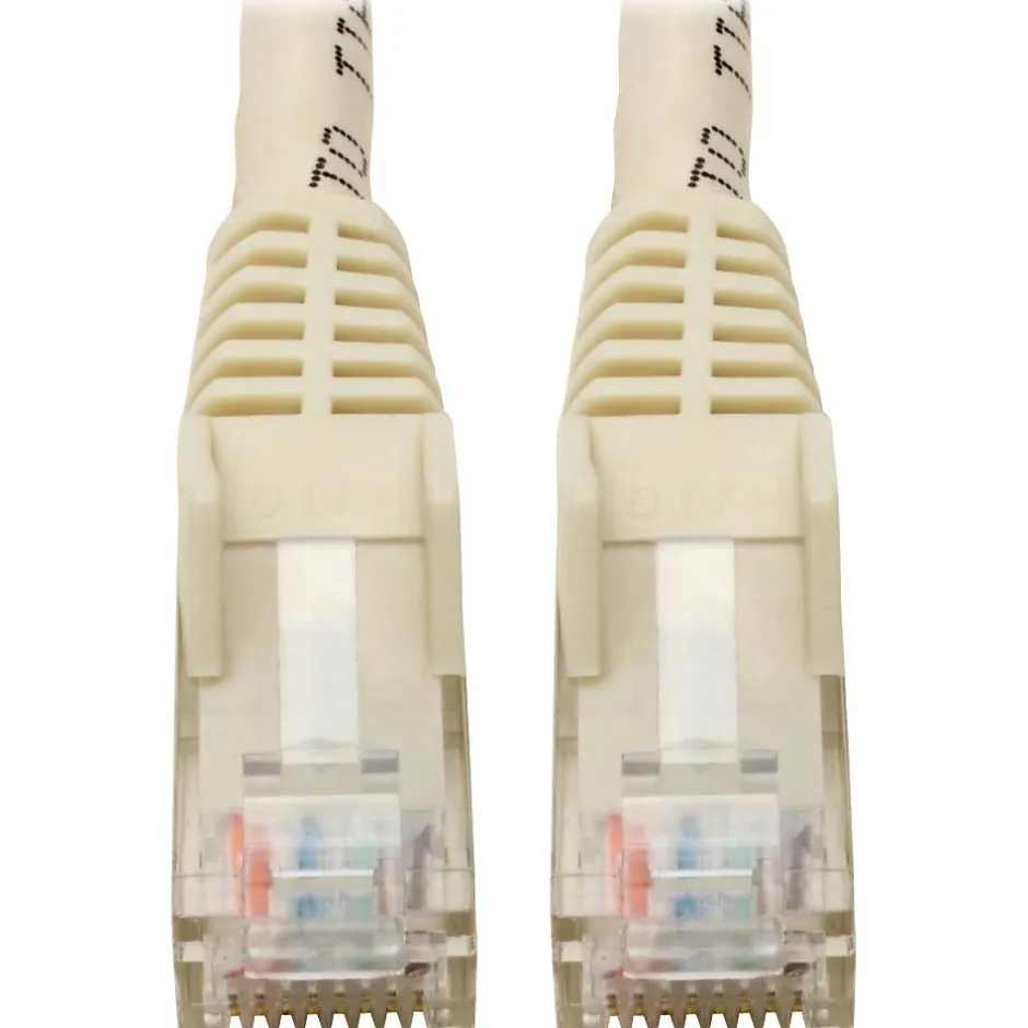 The N201-06N-WH Premium Cat6 Gigabit Snagless Molded UTP Patch Cable (M/M) is recommended for distributing data, voice and video through computers, network adapters, routers, servers, modems, hubs and switches in high-density data centers. Designed for fast transmission and excellent signal quality, this cable ensures peak performance throughout your local area network (LAN). It reduces impedance and structural return loss compared to standard 100 MHz wire. This six-inch white cable is designed for 1000Base-T (1 Gbps Ethernet), 10/100Base-T (Ethernet), 100 Mbps TPDDI, 155 Mbps ATM, ISDN, voice, Token Ring Type 3 and EIA/TIA applications. Manufactured from 24 AWG four-pair stranded UTP with a rugged PVC jacket, the N201-06N-WH delivers speeds up to 550 MHz/1 Gbps and flawless signal delivery, while keeping near-end crosstalk levels to a minimum. The RJ45 short-body connectors’ snagless design protects the locking tabs from being damaged or broken off during installation. Corrosion-resistant gold-plated copper contacts provide maximum conductivity and minimize data loss. Integral strain relief gives the cable extra flexibility, reduces stress, and helps the cable and connectors move freely without cracking. Meets most other current industry standards, including IEEE 802.3ab, 802.5, ISO/IEC 11801 and ETL (Cat6 draft 11).