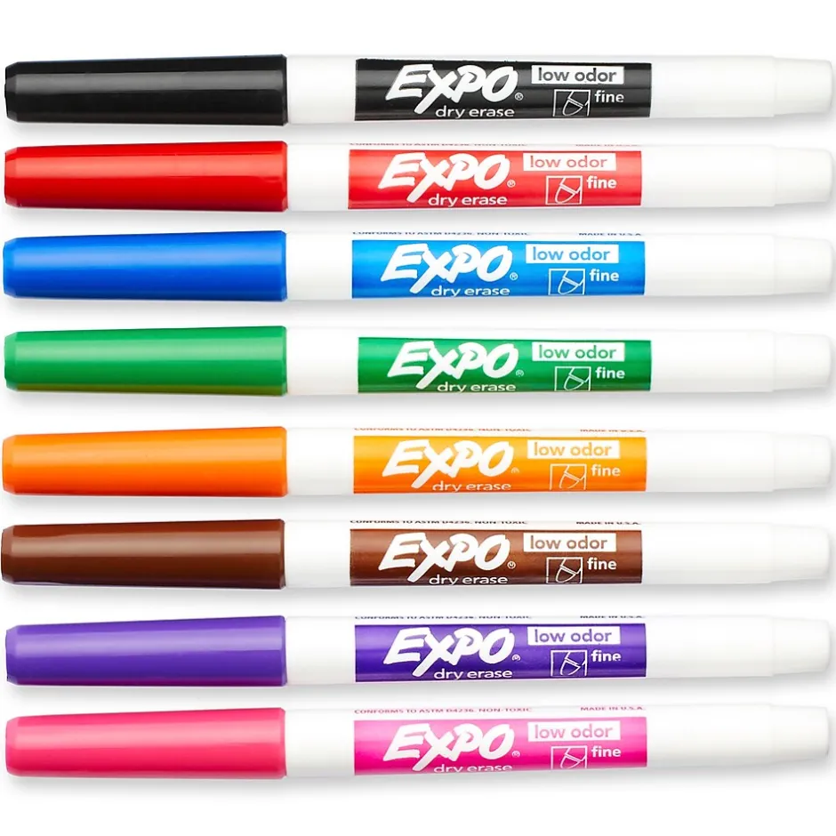 Write or draw on whiteboards or glass surfaces with these fine-tip dry-erase markers. The quick-drying, non-toxic ink is formulated to be low odor, making the markers ideal for regular use. Surfaces can be wiped clean with a dry cloth or eraser when lectures or presentations are done. Each pack of Expo low-odor dry-erase markers contains eight assorted colors for color-coding ideas.