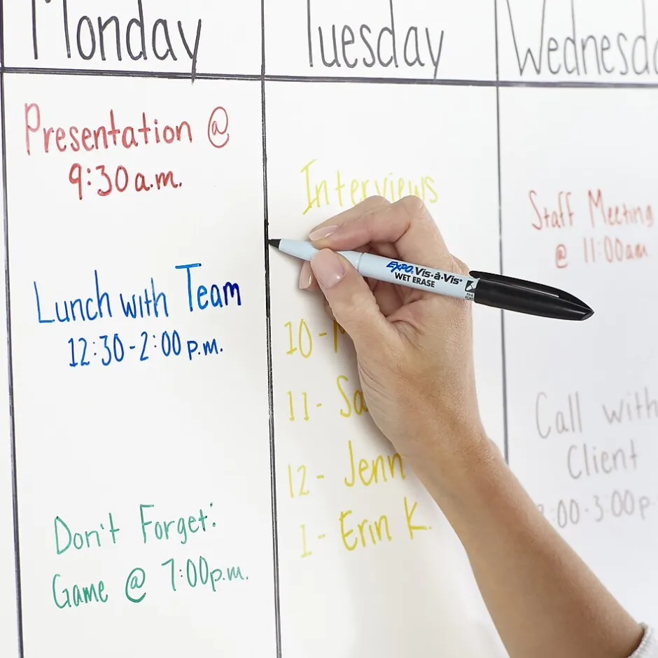 Lead classroom lectures or business meetings with these Expo Vis-a-Vis wet-erase markers. The wet-erase format is ideal for use on transparencies and overhead projectors, and the bright black ink lets you underscore important ideas in a different color. To remove the ink, simply wipe it away with a damp cloth. These Expo Vis-a-Vis wet-erase markers feature fine-point tips, providing precise lines for detailed notes or math equations.