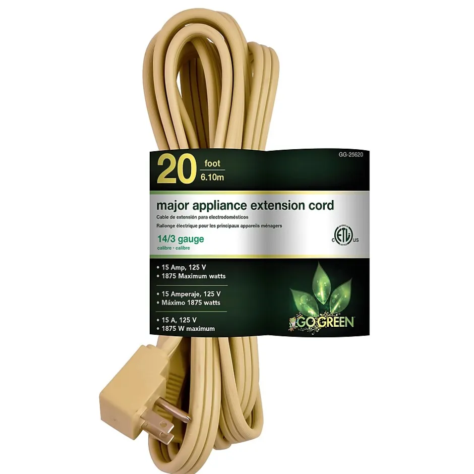 Make sure any cord can reach the plug with a 14/3 appliance cord from GoGreen Power. It can be used with a number of different appliances, such as an air conditioner, washer and dryer, dishwasher or a fridge. The beige extension cord features a grounded three prong head.