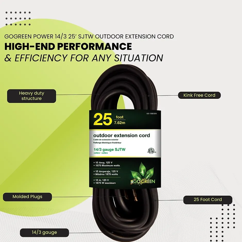 Increase your range with this GoGreen Power 14/3 Heavy Duty Extension Cord. It makes a smart addition to any collection of household supplies. This outdoor extension cord is extremely durable and stands up to the elements without issue. It resists moisture, abrasion and prolonged exposure to sunlight, making it dependable and long-lasting. Recommended for use with heavy-duty equipment and tools, the cord contains heavy-duty molded plugs.