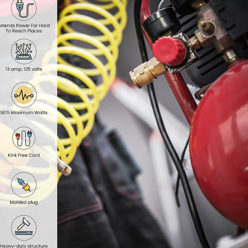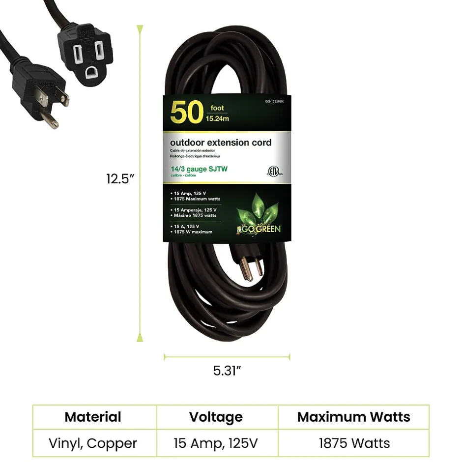 Increase your range with this GoGreen Power 14/3 Heavy Duty Extension Cord. It makes a smart addition to any collection of household supplies. This outdoor extension cord is extremely durable and stands up to the elements without issue. It resists moisture, abrasion and prolonged exposure to sunlight, making it dependable and long-lasting. Recommended for use with heavy-duty equipment and tools, the cord contains heavy-duty molded plugs.