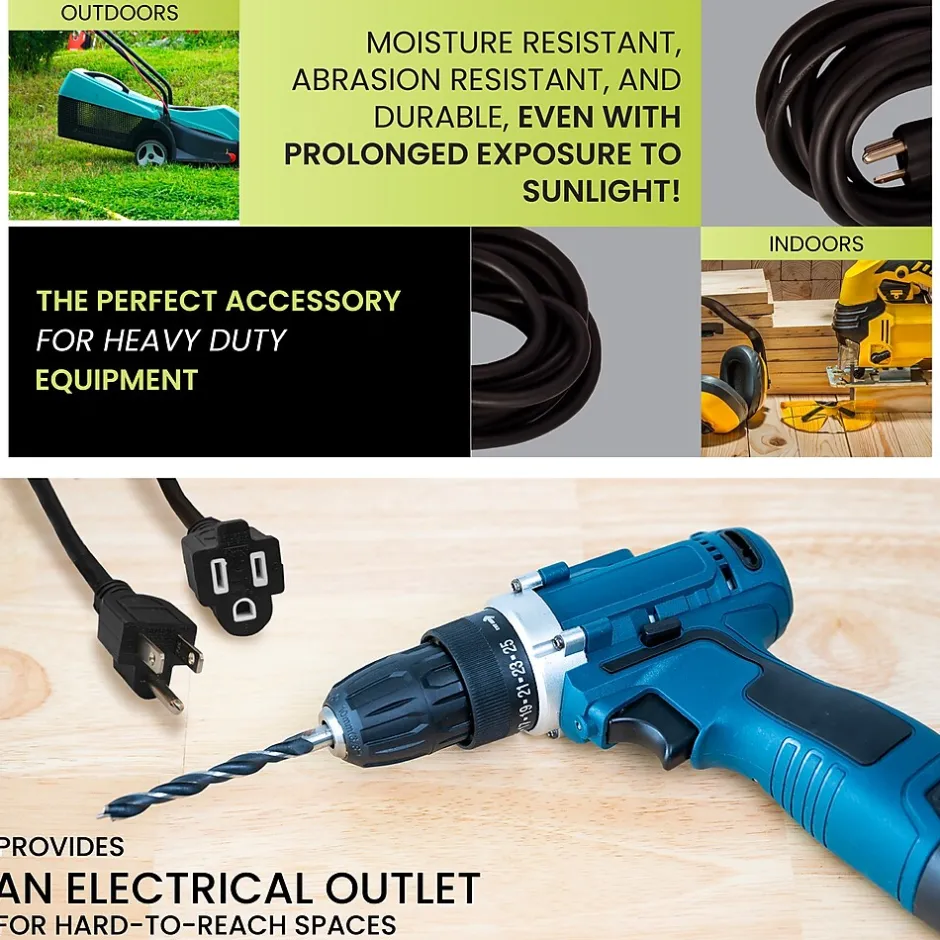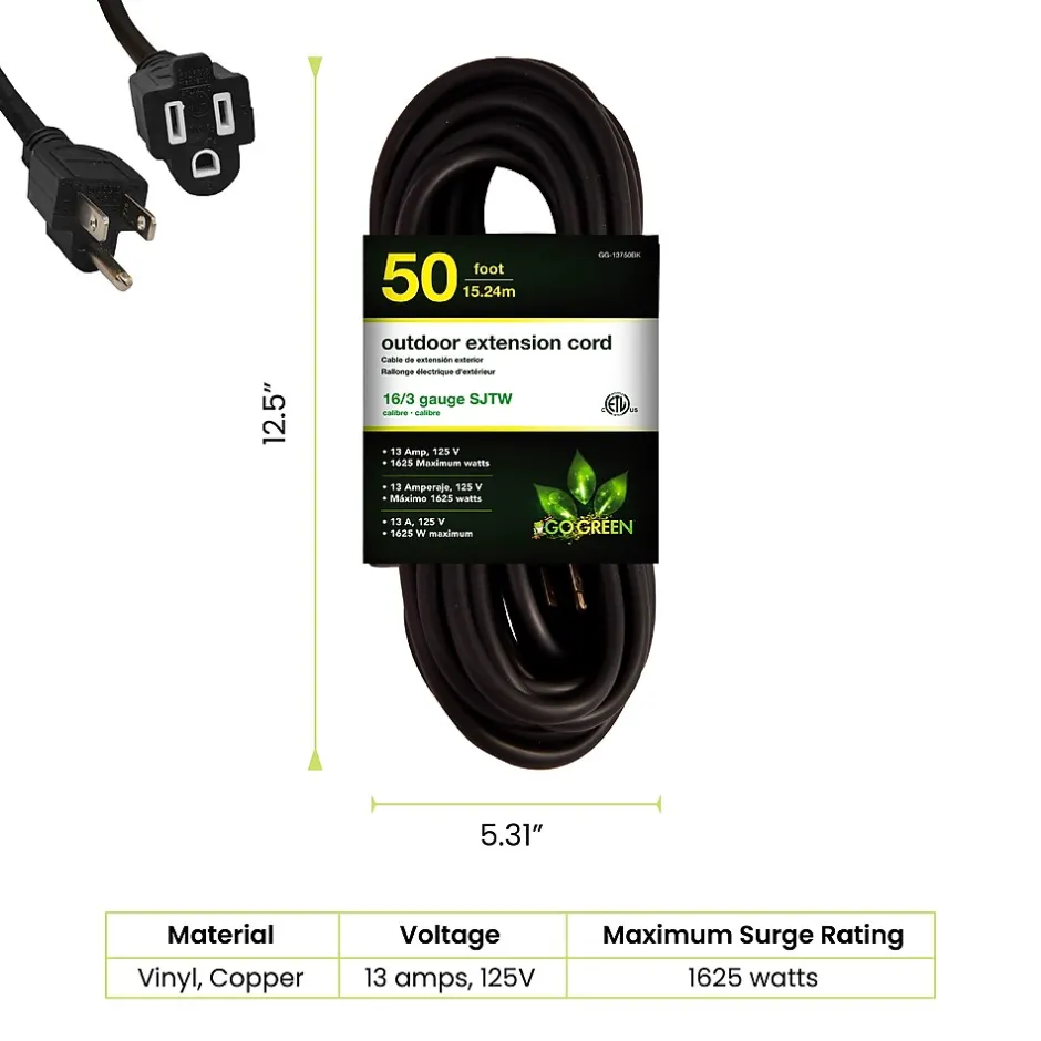 Increase your range with this GoGreen Power 14/3 Heavy Duty Extension Cord. It makes a smart addition to any collection of household supplies. This outdoor extension cord is extremely durable and stands up to the elements without issue. It resists moisture, abrasion and prolonged exposure to sunlight, making it dependable and long-lasting. Recommended for use with heavy-duty equipment and tools, the cord contains heavy-duty molded plugs.