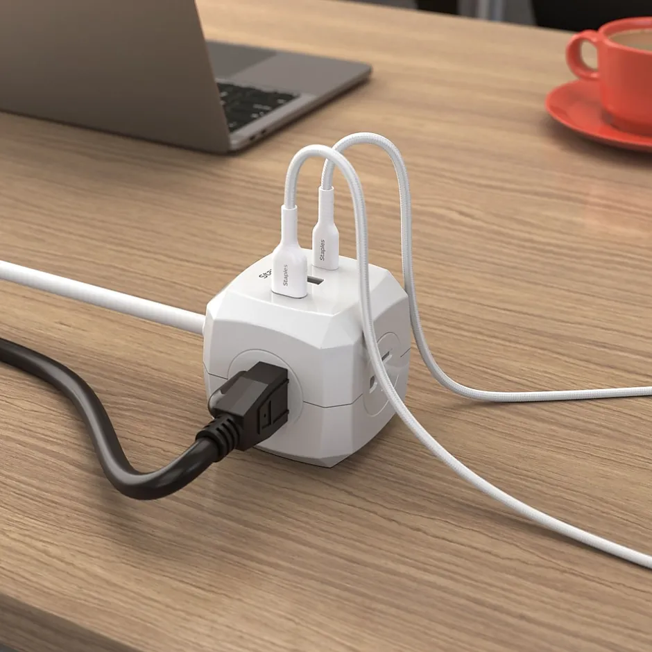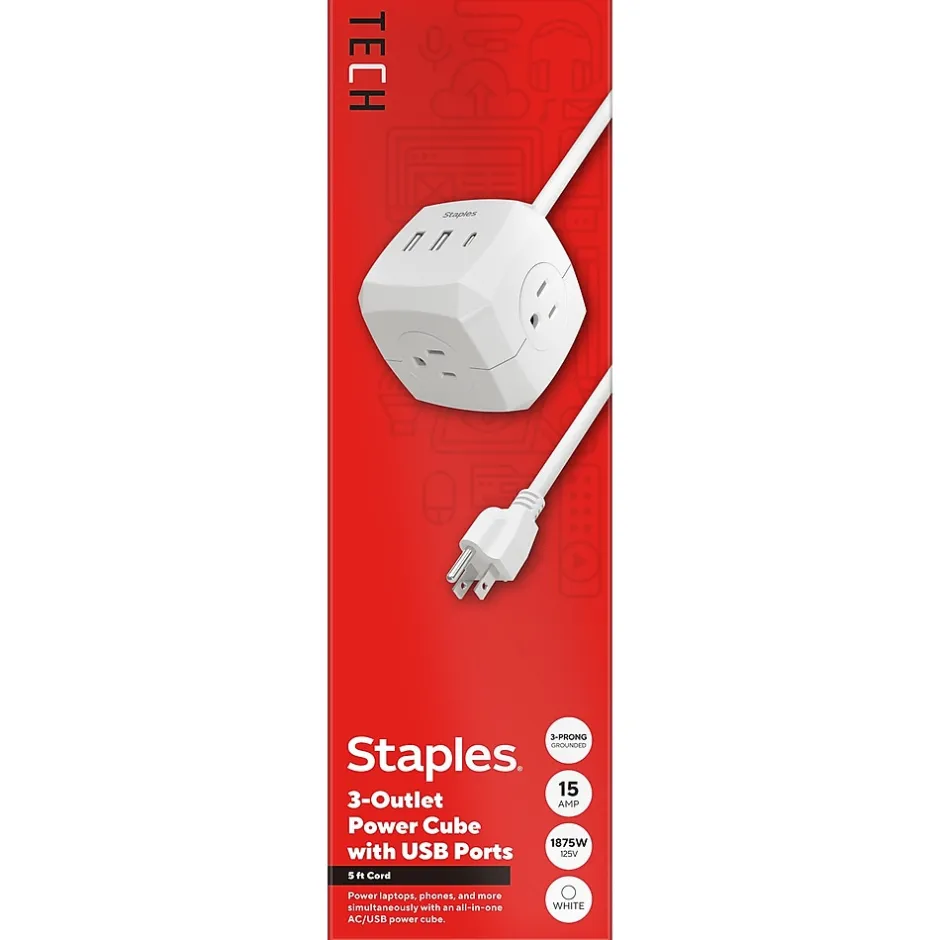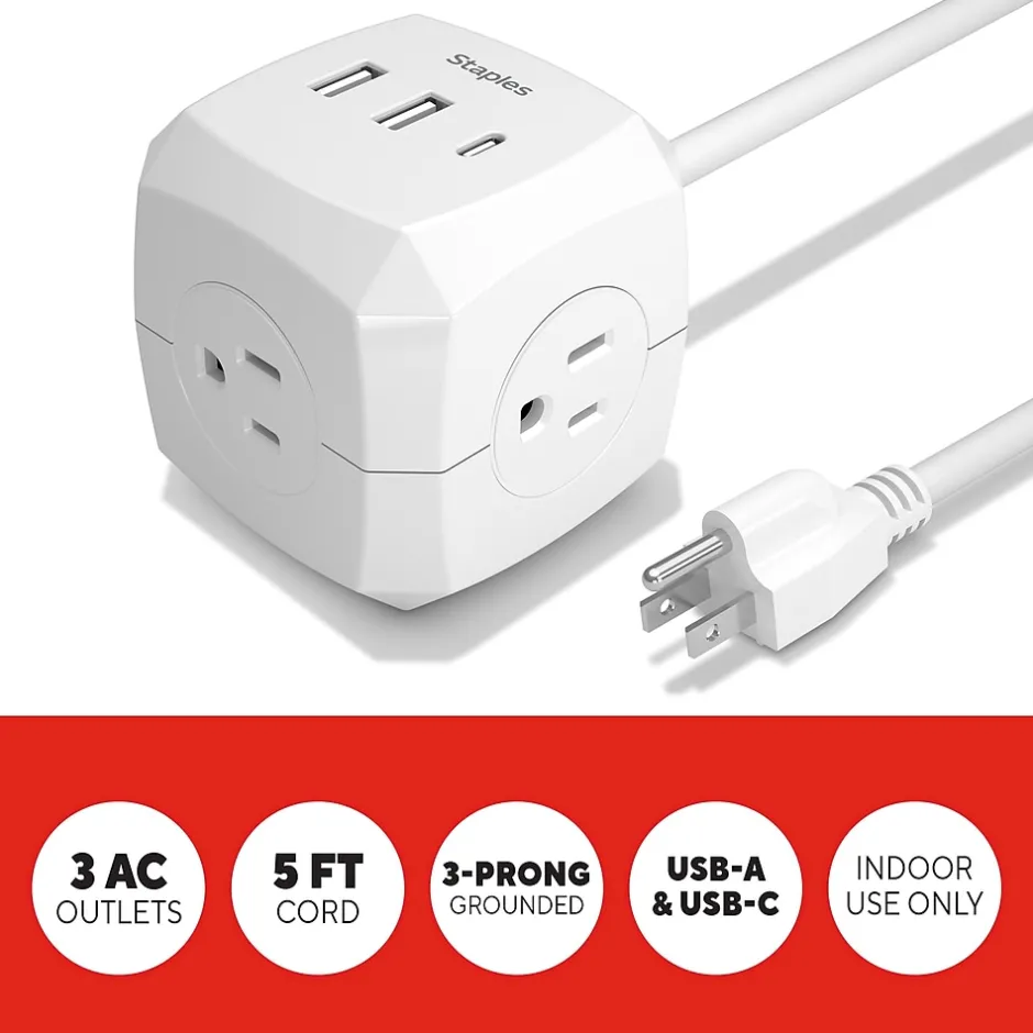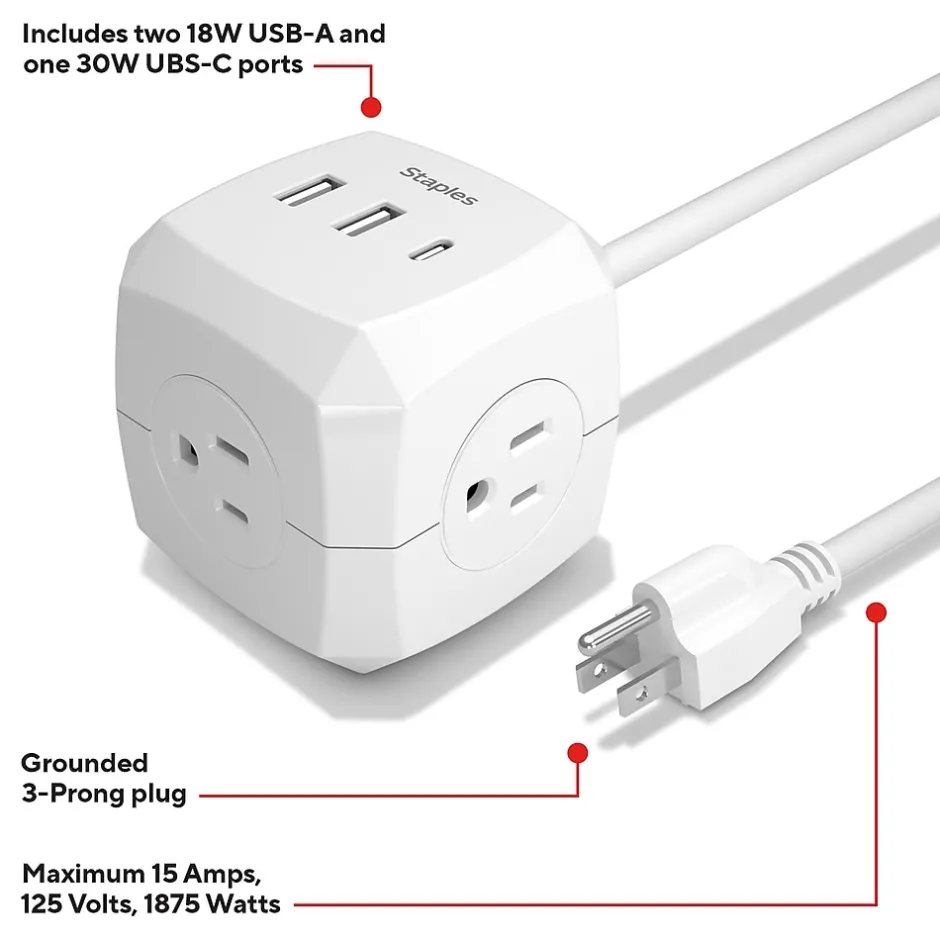 Add versatility to your power solutions with this power strip boasting three AC outlets, two 18W USB-A ports and one 30W USB-C port. You’ll be able to power multiple devices with a variety of different plug types. The 5-foot cord is perfect for getting power where you need it without making clutter, ensuring you convenience and efficiency. The outlets are grounded with three prongs for safety, and the strip is designed for indoor use in dry areas only. The overall maximum power output capacity is 15 Amps, 125 Volts, and 1875 Watts. The durable 14-gauge thickness makes it heat-resistant, so it’s perfect for powering appliances and other high-current items.