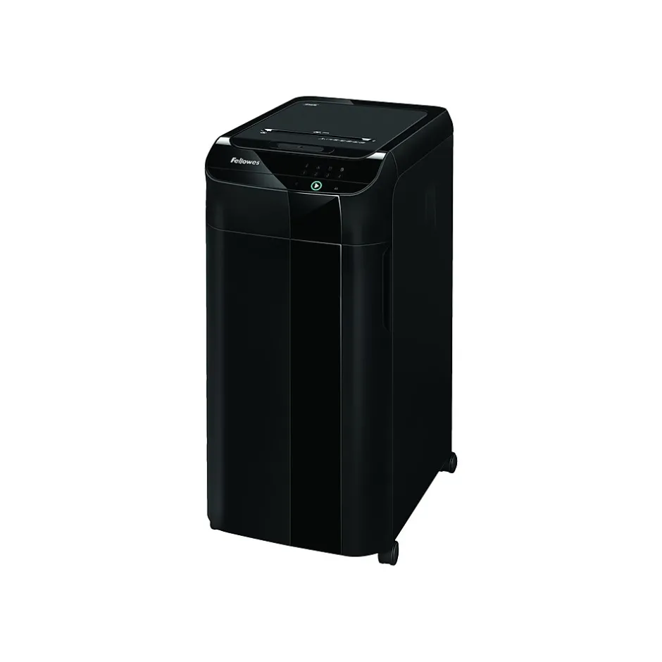 Make your way through thick stacks of old paperwork with this cross-cut shredder. The automatic feeder handles up to 350 pages for fast, efficient operation, while the powerful blades slice through glossy paper, credit cards, DVDs and CDs. With an automatic reverse function, this shredder prevents jams before they happen. Rolling casters make it easy to slide this shredder out of the way when it’s not in use. Featuring an 18-gallon waste bin, this Fellowes AutoMax cross-cut shredder keeps paper shreds contained until they’re ready for disposal.