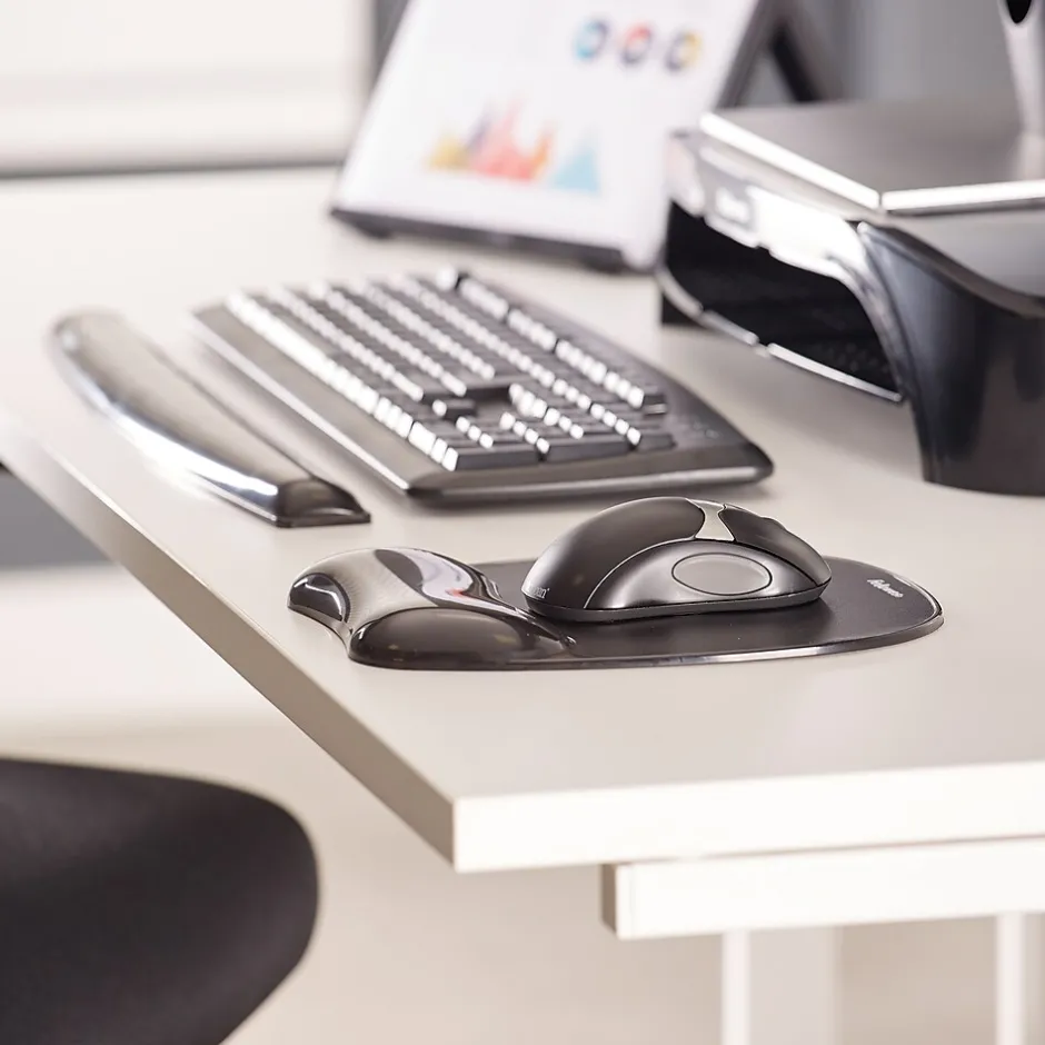 Keep your wrist aligned and express your style with this stylish transparent gel keyboard wrist support.The Fellowes Crystals™ ergonomic 9112201 keyboard wrist rest in black uses gel technology that conforms to your wrist andprovides superior comfort while relieving wrist pressure.