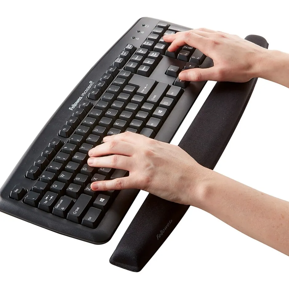 Position your wrist for comfort with this ergonomic memory foam keyboard pad. The soft cushioned pillow offers a plush feel, while the double jersey covering withstands regular wear and tear. A non-skid base prevents slipping to keep this pad securely in place on your desk or table. This Fellowes black wrist rest 9178201 keeps its shape even with daily use for added resiliency.