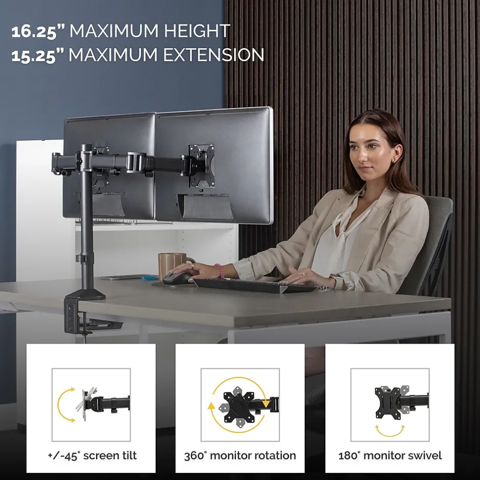 - SUPPORTS: Dual monitors up to 27″ and 17.6 lbs., optimizing desk space with ergonomic design ideal for home or office