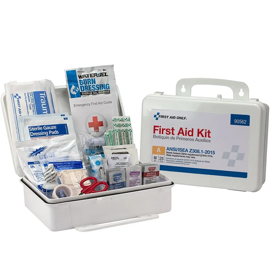 Designed for use in small offices, vehicles and work sites, this weatherproof plastic case is wall-mountable, yet has a handle for easy carrying. ContentsĀ meet the 2015 ANSI Class A requirements and are sufficient to treat 25 or more people.
