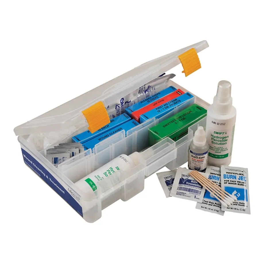 - ESSENTIAL-RESPONSE MODULE B – WOUND CLEANING & TREATMENT: (1) Hydrogen peroxide solution (4 oz spray), (2) Sting & Bite swab, (2) Eye wash 1 oz sterile, (3) Vinyl Gloves (pairs), (3) Emergency water pouches (4oz), (10) Burn gel 0.9gm packets, (10) Triple antibiotic packs 0.5gm, (10) PVP iodine swabs 1/2cc each, (10) Antiseptic wipes, (10) Alcohol wipes, (12) Cotton tip applicator 3″, (14) Hydrocortisone 1% 1/8 oz foil pack
