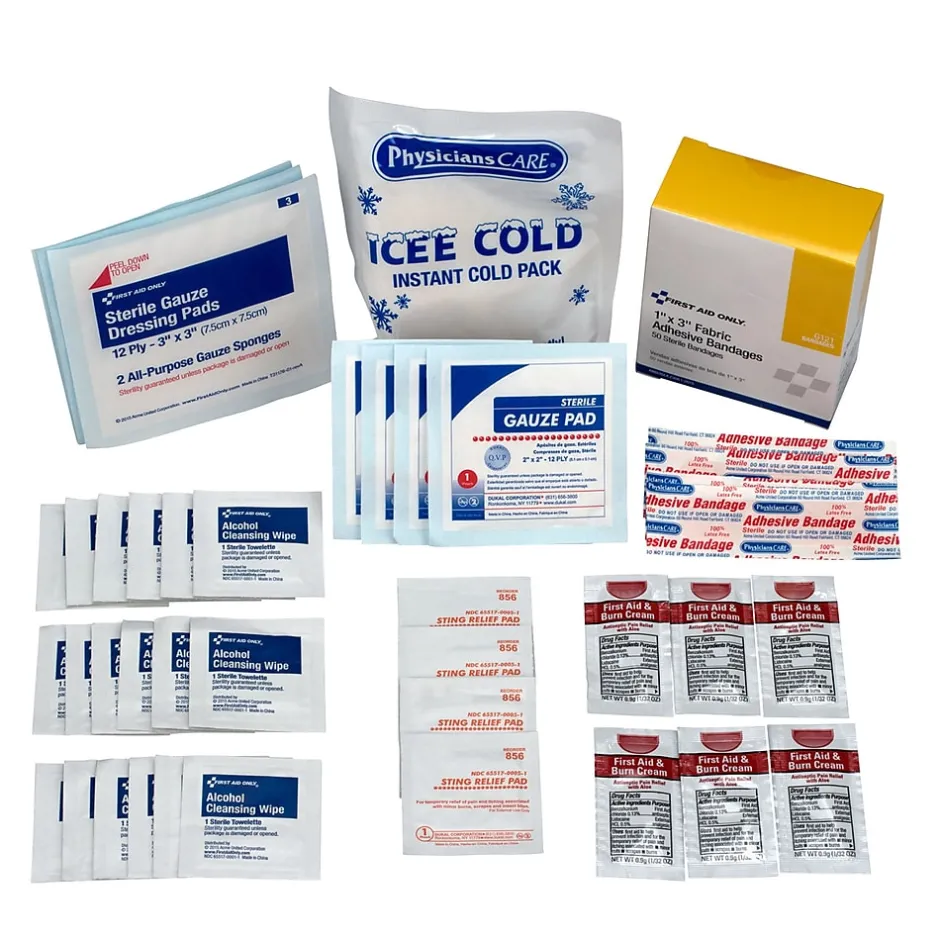 - Refill includes: Adhesive Bandages, Alcohol Wipes, Cold Pack, Burn Cream, Sterile Gauze Pads and Sting Relief Wipes.