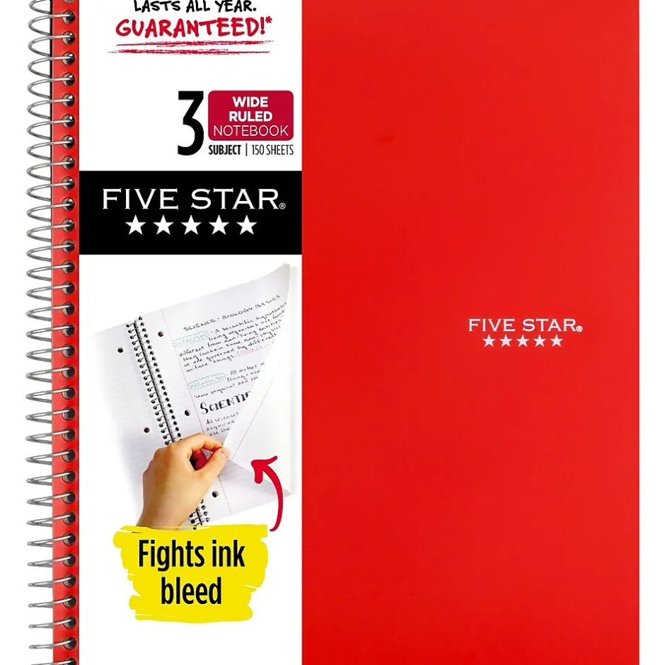 LASTS ALL YEAR. GUARANTEED!* Five Star 3 subject notebook has 150 double-sided, wide ruled sheets that fight ink bleed and are perforated for easy tear out. Sheets measure 8″ x 10 1/2″ when torn out. Tough pockets help prevent tears and hold 8″ x 10 1/2″ loose sheets. Covers are water resistant to protect your notes all year. Spiral Lock wire helps prevent snags on clothes and backpacks. Made with SFI certified paper. Notebook is recyclable – just remove the reinforcement tape on the pocket and recycle the rest! Available in Fire Red, Harvest Yellow, Forest Green, Tidewater Blue, Amethyst Purple, and Black. Color chosen for you.