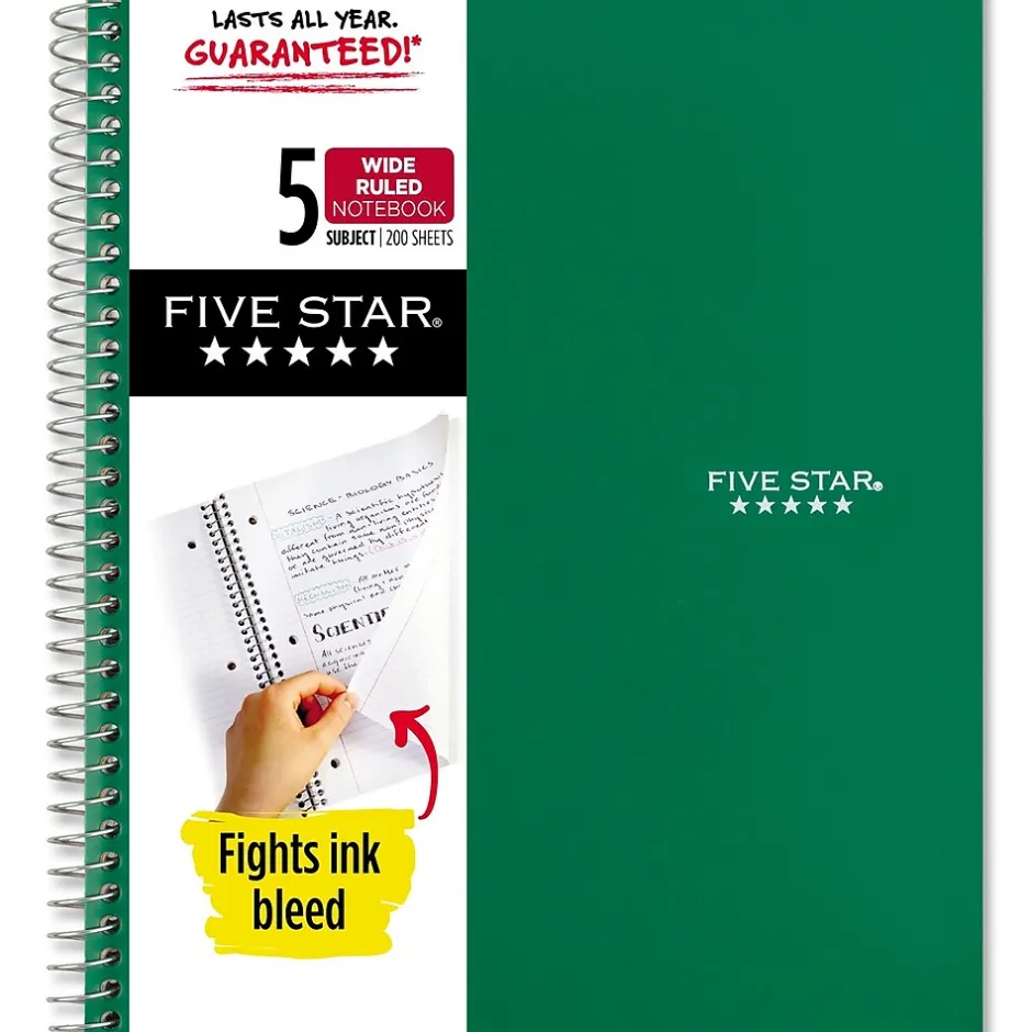 LASTS ALL YEAR. GUARANTEED!* Five Star 5 subject notebook has 200 double-sided, wide ruled sheets that fight ink bleed and are perforated for easy tear out. Sheets measure 8″ x 10 1/2″ when torn out. Tough pockets help prevent tears and hold 8″ x 10 1/2″ loose sheets. Covers are water resistant to protect your notes all year. Spiral Lock wire helps prevent snags on clothes and backpacks. Made with SFI certified paper. Notebook is recyclable – just remove the reinforcement tape on the pocket and recycle the rest! Available in Fire Red, Harvest Yellow, Forest Green, Tidewater Blue, Amethyst Purple, and Black. Color chosen for you.
