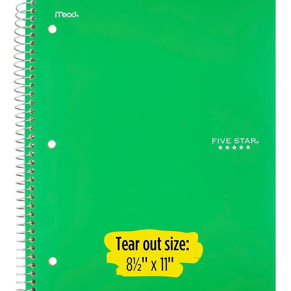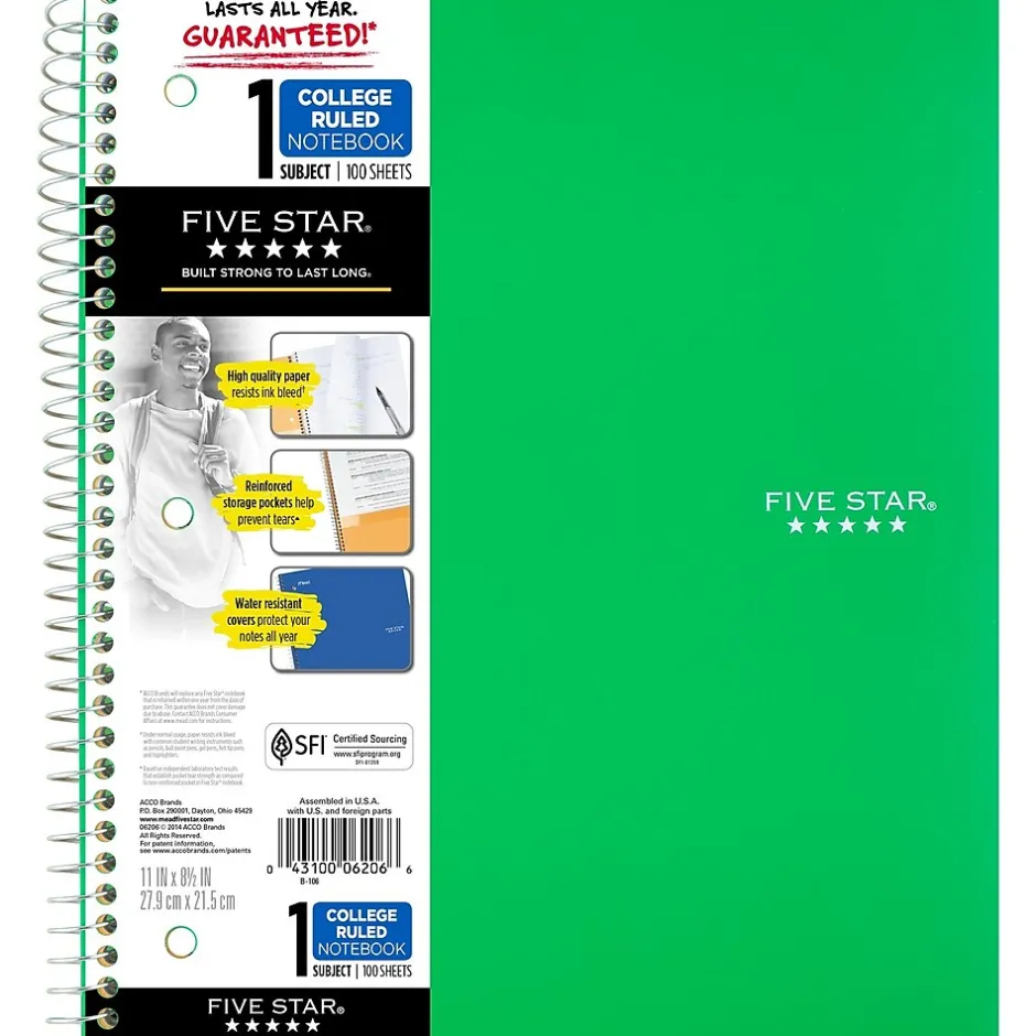 Mead® Five Star® Wirebound notebook in green color features durable plastic front cover and coated natural Kraft back cover. Notebook with 3-hole punched has 2-Pocket dividers to store loose papers and contains 100 pages.