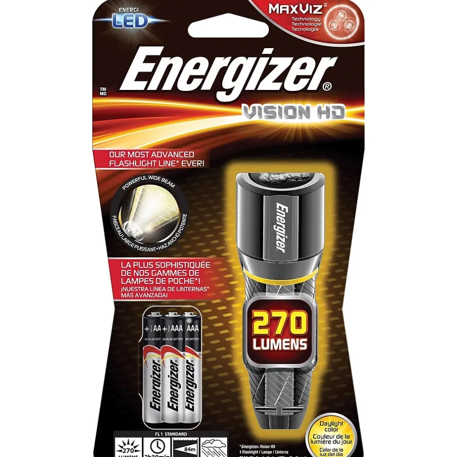 Vision HD Compact light delivers high-performance innovation in a convenient size. Designed to fit in your vehicle, pocket or bag, this advanced flashlight with 270 lumens is perfect for a wide variety of tasks. Unique MAXVIZ technology delivers a wide, powerful beam that provides you with sharp, high-definition vision. Beam distance is 84 meters. A smooth, digital switch provides access to multiple beam settings: high, power saver and emergency strobe modes. Featuring an advanced alloy construction, the Vision HD is a durable solution that delivers powerful daylight-color illumination at home or on-the-go. It runs on three AA batteries.