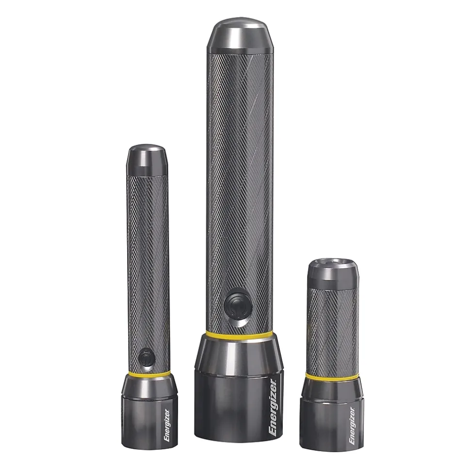 - Metal LED flashlight includes three AAA Energizer® MAX® batteries