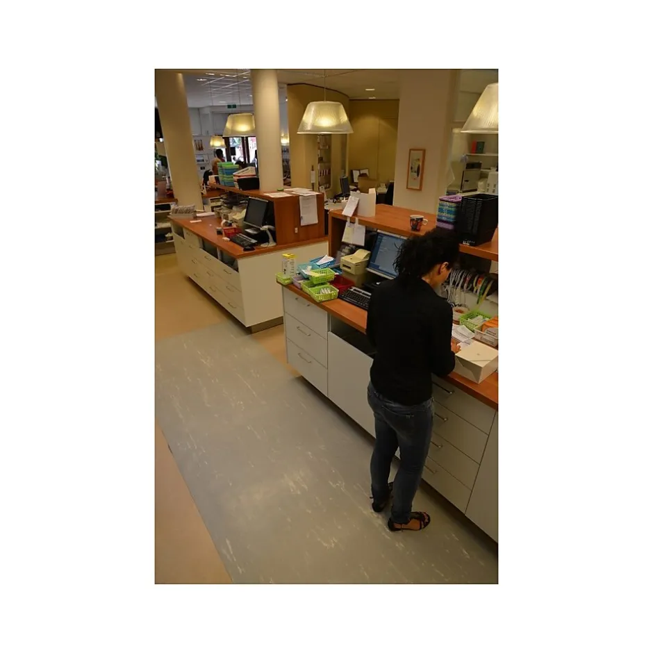 The NoTrax Sof-Tyle is an anti-fatigue floor mat that provides comfort and ergonomic support while complementing any decor with a stylish marble pattern. The durable vinyl top surface is easy to sweep or clean with a damp mop, and is combined with a dense closed-cell foam base utilizing proprietary UniFusion technology. This virtually eliminates the possibility of delamination. This laminate floor mat comes with Redstop, a uniquely engineered nonslip backing technology that eliminates the slipping and sliding on smooth flooring such as tile, wood, marble, and treated concrete. For dry applications such as lab testing areas, checkout counters, order fulfillment lines, and pharmacies. The sloped beveled edges reduce tripping hazards and allow easy access on and off the mat.