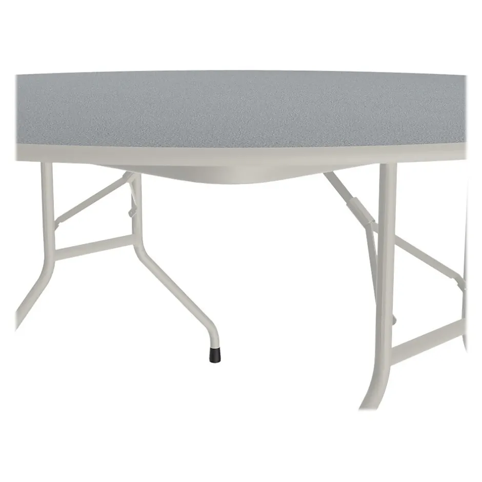 - Gray table base is made of 14-gauge steel and the surface is made of two-sided thermally fused laminate with a high-density particle board core