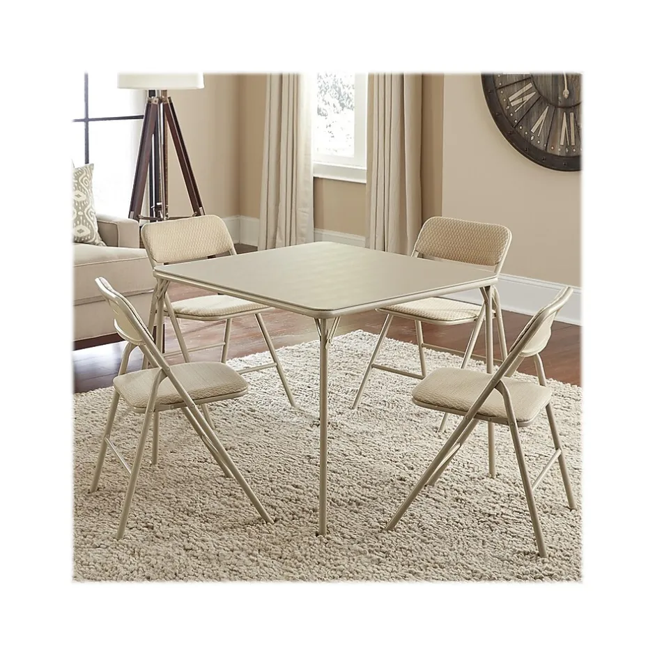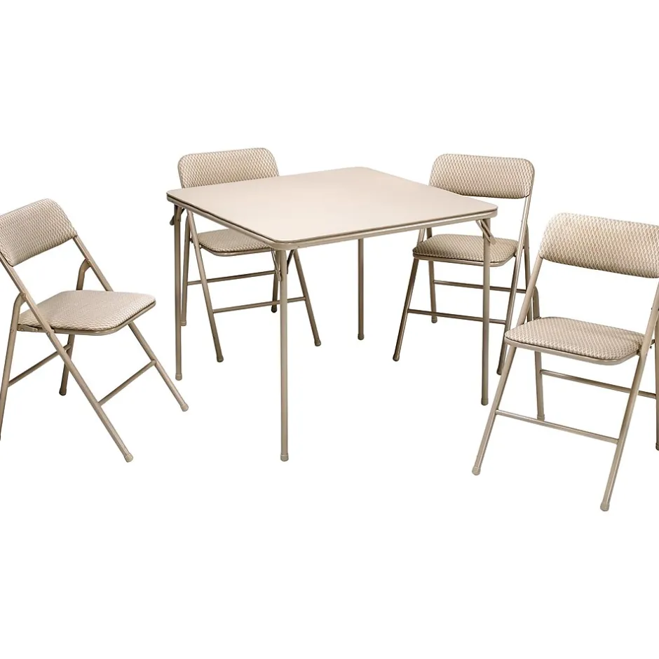 This Cosco five-piece folding table and chair set will make you ready for guests with an instant seating arrangement for four. The set will enhance any atmosphere, ranging from family gatherings, parties, or small space living if you’re looking for a set to promote that lifestyle. Comfortable for entertainment and compact for storage, this set features durable steel frames and a powder-coated finish. This tan-colored set comes with a sturdy 34″ square table with low-maintenance and easy-to-clean tabletop no matter the mess. The cross braces and tube-in-tube reinforced frame of the table guarantee a long-term investment you won’t be disappointed in as you use it as desired. The four chairs, built for maximum comfort and durability, are upholstered in an attractive fabric with padding on the seat and back so you can relax in style as you converse with family and friends. The table and chairs are made of a sturdy steel frame and rubber tips to protect your floors without fear of slipping while in use and fold neatly for noninvasive storage techniques when needed.