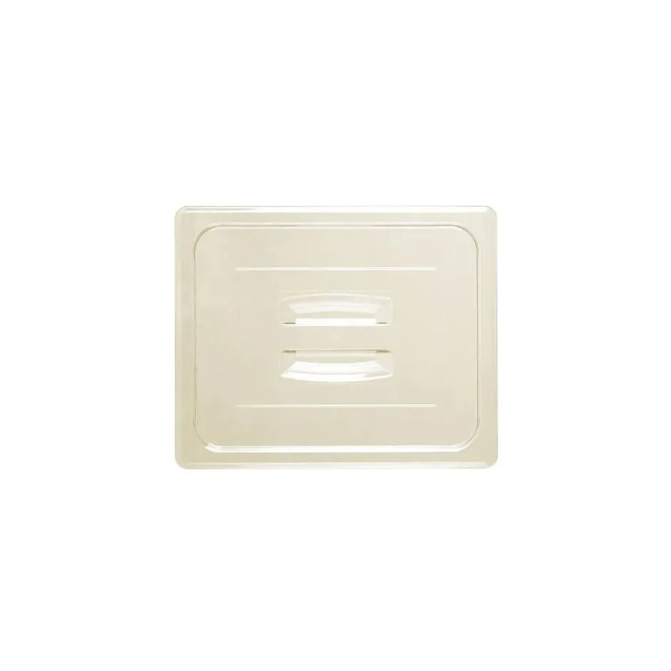 This amber Cambro 20HPCH150 H-Pan 1/2 size high heat handled lid is perfect for holding high heat and freezing foods in any commercial kitchen. It’s built with strong, durable materials to withstand extreme temperatures from -40 to 300 degrees Fahrenheit and will help maintain your food’s temperature after it’s taken out of the oven or freezer. To aid in storage and transport, this flat cover conveniently stacks with similar items to create more usable space.