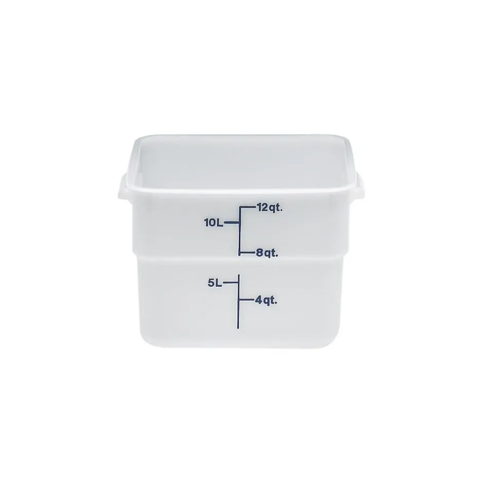 Safely store your products with this Cambro 12SFSP148 12 Qt.. square food storage container! This food storage container is made of impact resistant solid white plastic that won’t be stained or harmed by food acids, oils, and alcohol. Thanks to its square shape, this container can be conveniently packed onto shelves without wasting space, while its easy-to-read midnight blue-colored gradations allow you to manage your inventory at a glance. This square container can withstand temperatures from -40 to 210degrees Fahrenheit, ensuring its safe use in both refrigerators and freezers.