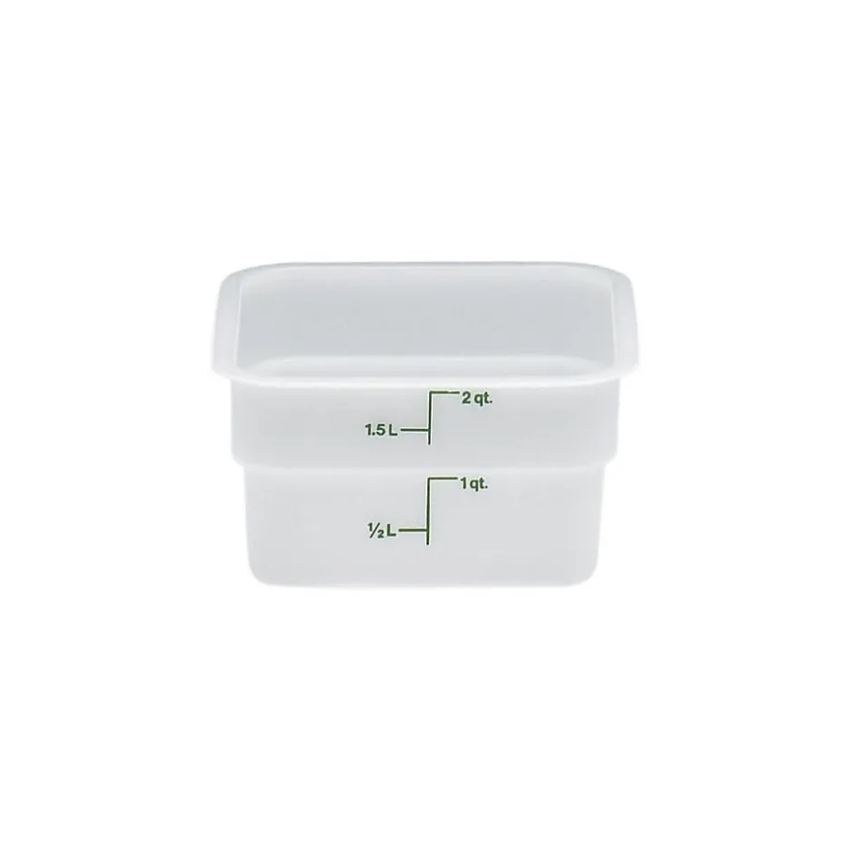 Safely store your products with this Cambro 2SFSP148 2 Qt.. square food storage container! This food storage container is made of impact resistant solid white plastic that won’t be stained or harmed by food acids, oils, and alcohol. Thanks to its square shape, this container can be conveniently packed onto shelves without wasting space, while its easy-to-read kelly green-colored gradations allow you to manage your inventory at a glance. This square container can withstand temperatures from -40 to 210 degrees Fahrenheit, ensuring its safe use in both refrigerators and freezers.