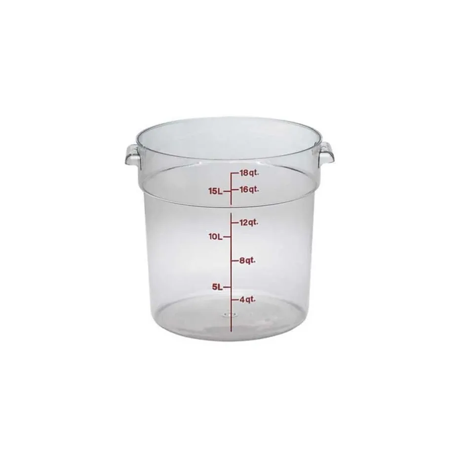 Cambro® Food storage container in clear color is made of polycarbonate for durability and has a capacity of 18 qt to store produce. 12 5/8″ Container of 14 7/8″ Dia is stain/ break resistant and withstands temperatures of range -40 to 210 deg F.