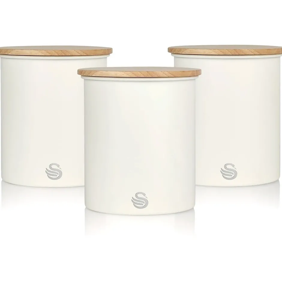 Add some Scandinavian-inspired style to your kitchen with Swan’s Nordic set of 3 storage canisters. Both secure and sophisticated, each canister is made from durable carbon steel, topped with an airtight bamboo lid to keep your coffee, sugar, tea and other perishables fresh for longer. The containers have a spacious capacity of 1.84 litres, letting you store a large quantity of loose ingredients inside each one. The matching set features a soft touch finish, coated in the perfect colour to match the rest of the collection, with a wooden-textured lid to create a warm, calming appearance on your countertop.
