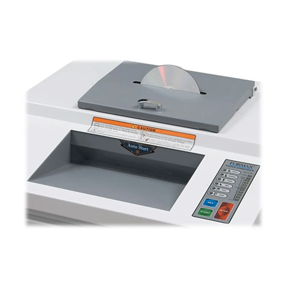 The Formax OnSite FD8704CC multimedia office shredder offers commercial-grade quality and unmatched features in a compact design that is great for the office environment. With two dedicated feed openings, the FD8704CC is capable of shredding paper, CDs, DVDs, USB thumb drives, MiniDV tapes, and ZIP/floppy disks. Paper can be shred at a speed of up to 12 feet per minute, with a shred size of 5/32″ x 1 5/8″. The FD 8704CC has a waste bin capacity of up to 28 gallons. Standard features include heat-treated steel blades, an easy-to-use LED control panel, a lifetime guaranteed waste bin, and a powerful AC geared motor. In addition, the Eco mode saves energy by automatically switching into standby mode after 5 minutes of inactivity.
