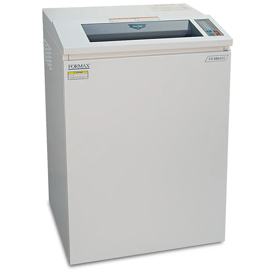 Experience unparalleled durability and security with the Formax FD 8502CC cross-cut office shredder. Built with all metal construction, this shredder guarantees top-tier information security that efficiently transforms sensitive documents into 5/32” x 1-15” particles. With a 16” extra wide feed opening, this office shredder can accommodate up to 25 sheets at one time at a rapid 35 feet per minute shredding speed. The FD 8502CC’s robust design features a lifetime-guaranteed heavy-duty waste bin, heat-treated steel blades, and a powerful AC geared motor with heavy-duty steel gears, ensuring longevity, minimal noise, and continuous operation.