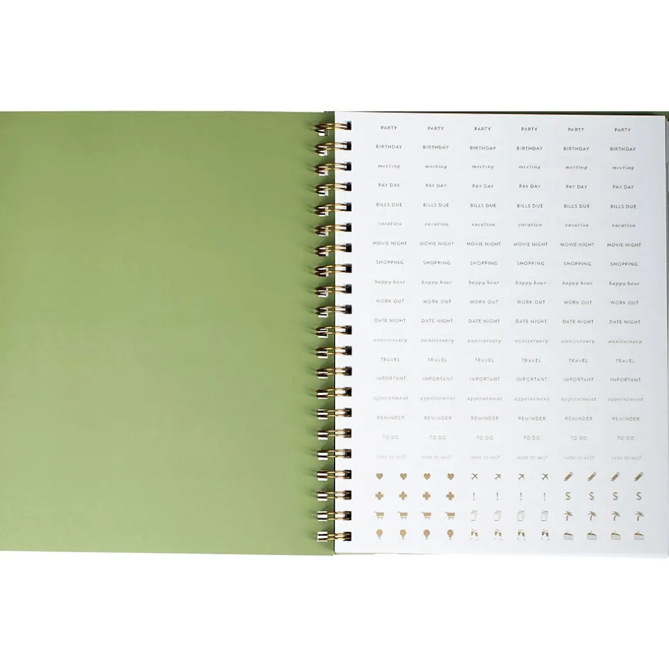 Stay organized and on track with the Fringe Magnolia work-life balance planner. Features include a sturdy paperback cover with metallic gold-tone foil design accent, 12 tab dividers (spanning from January 2025 to December 2025), monthly grid spreads, weekly planning pages to track work and life activities, pages for notes, a gold-tone foil sticker sheet, and a twin-ring spiral binding.
