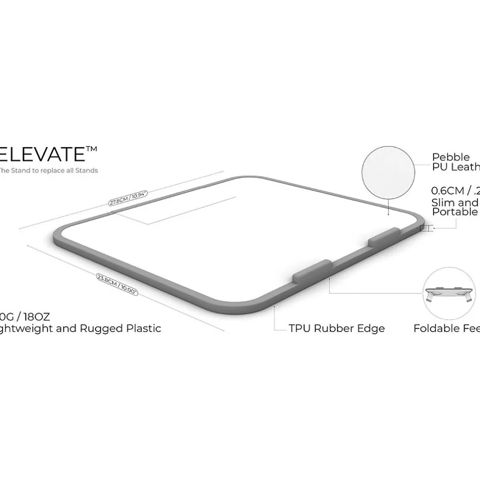The Function101 Elevate stand for MacBooks and iPads expands to create four practical positions that raise your laptop and screen for better ergonomics and great-looking video calls. The minimalistic form factor maintains a clean workspace, while the slim foldable design makes it easy to store or take on the go. Elevate is crafted from lightweight, ultradurable plastic with an eco-leather top surface and rubberized edge to protect against accidental drops.