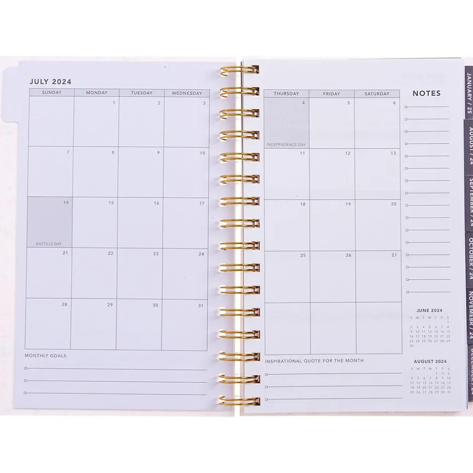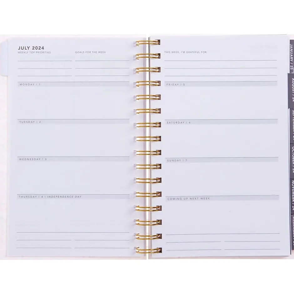 - One month per view, one week per view; monthly layouts include sections for notes and goals and are equipped with tabs for easy access; each weekly spread includes the week’s priorities, with space to write notes for each day, including the weekend