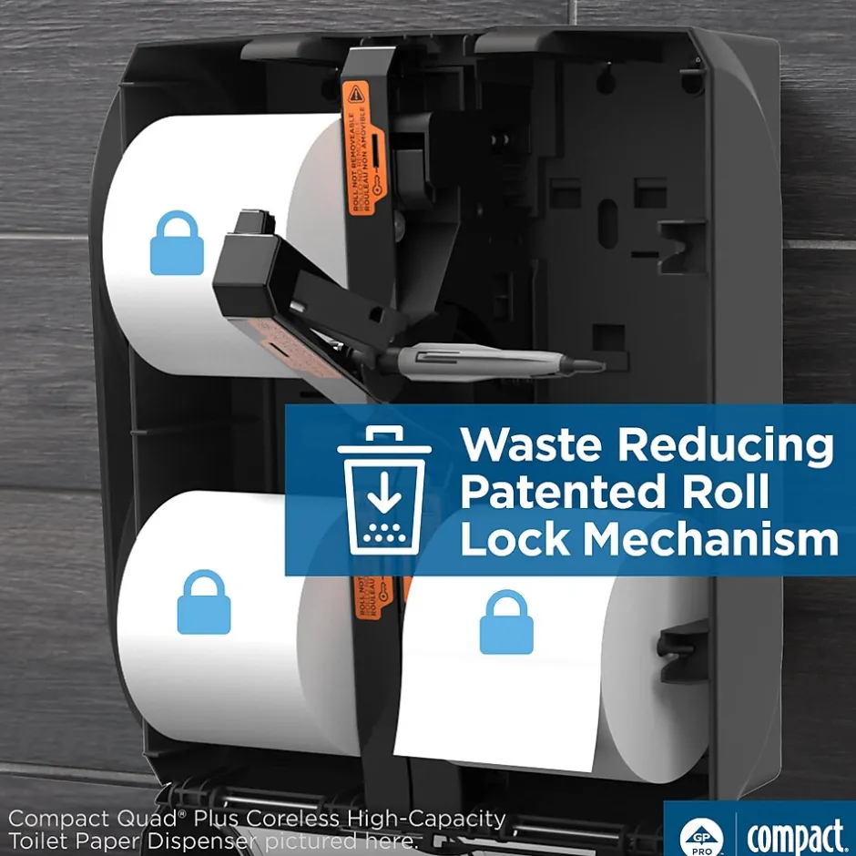 The Compact Quad® Plus Toilet Paper Dispenser was designed for maximum wastereduction, ease of maintenance, and hygiene. It is a coreless toilet paper dispensingsystem that holds up to 6,000 2-ply or 12,000 1-ply sheets. The Compact Quad (R)Plus Dispenser features a patented roll lock mechanism to help ensure maintainers donot replace rolls prematurely or have to fumble with sleds. When combined with theroll lock mechanism, our coreless toilet paper rolls enable nearly 100% paper usage.When the dispenser is opened, the empty roll holders automatically drop down,allowing for the efficient replacement of rolls that are completely empty. Additionally,the push functionality of the lock makes it easy to access and use the dispenser key.GP PRO is a division of Georgia-Pacific Consumer Products. We deliver well-designed,durable and easy-to-maintain professional solutions to meet the handwashing andcleaning needs for a range of business applications.