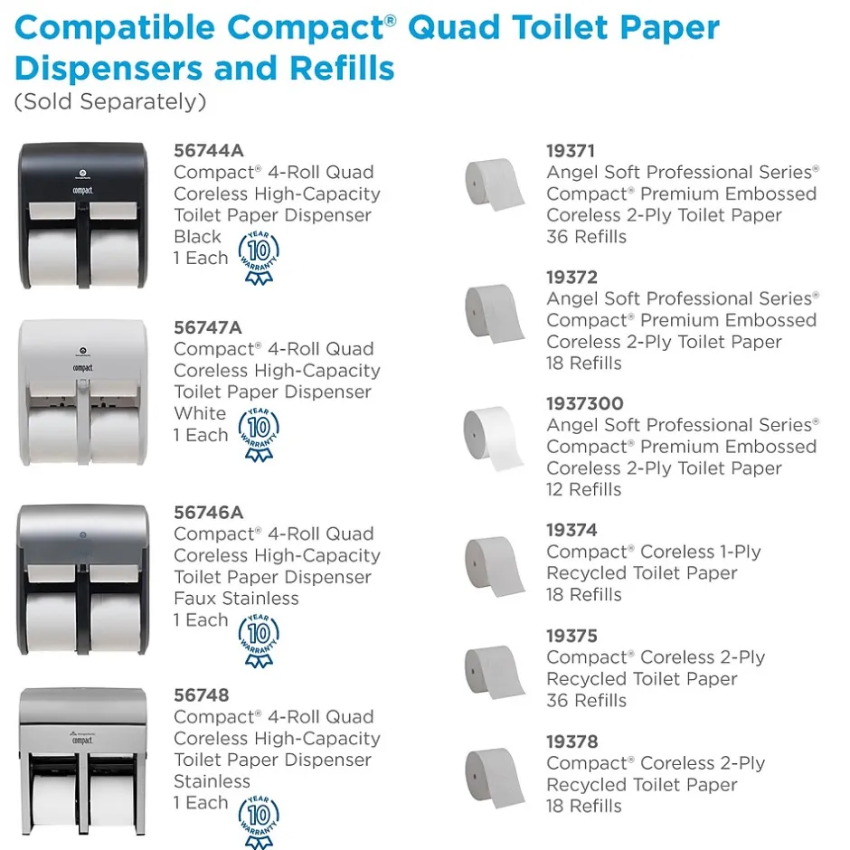 | Color Family Total paper dispenser type refers to the dispenser design and indicates the type and size of toilet paper roll suitable for the dispenser. | Coreless |