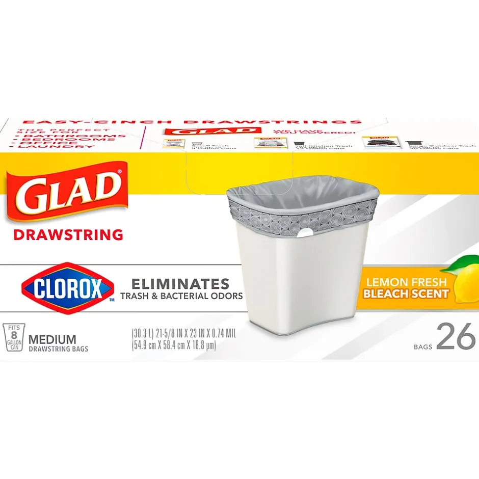 Glad and Clorox have joined forces to create a trash bag with the strength of Glad and the odor-fighting power of Clorox. Glad with Clorox Medium Drawstring Trash Bags eliminate trash and bacterial odors on the bag to help keep your home feeling fresh and healthy. These 8 gallon garbage bags fit medium size trash cans and are ideal for bathrooms, bedrooms, offices, nurseries and laundry rooms. Featuring a grey bag and printed hexagon design around the hem of the bag, these trash bags add a design detail to any room when they are folded around the edge of the can. Just a quick cinch of the durable drawstring makes trash removal simple. These versatile trash bags feature the clean smell of Lemon Fresh Bleach Scent. Glad with Clorox garbage bags work as hard as you do to help maintain a fresh and healthy feeling home with a versatile design for bins around the home.