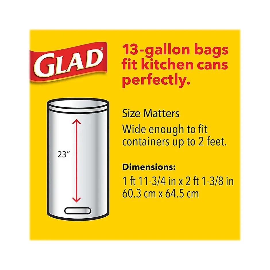 The Glad Quick-Tie tall kitchen trash bag is designed with strong and dependable flaps to keep the bag securely shut. This trash bag features a diamond texture that stretches around objects to prevent rips and tears, making it easy to lift and transport the bag even when fully loaded. The four Quick-Tie flaps close the bag securely to keep trash inside. The 13 gal. capacity is perfect for kitchens, break rooms, or workplaces.