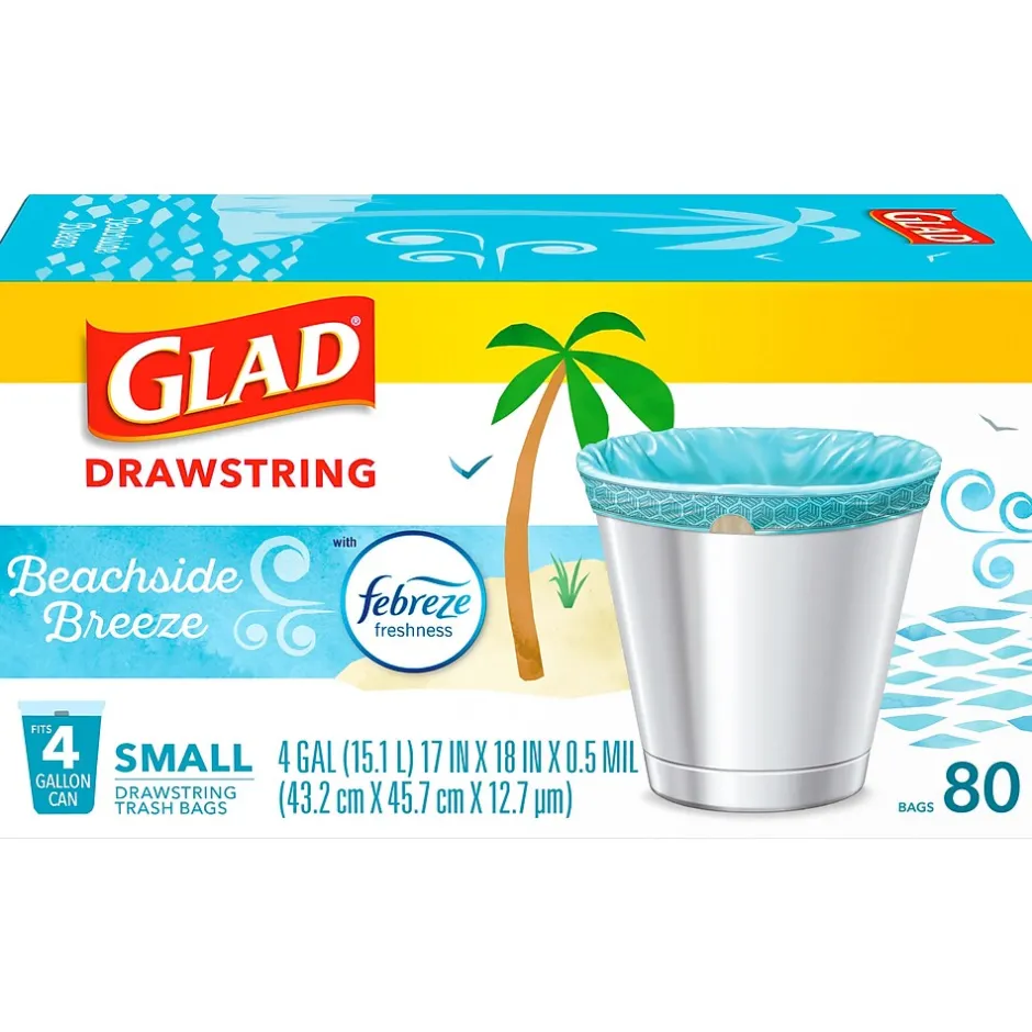 Fight nasty kitchen odors with Glad Small Drawstring Trash Bags and the steady release of Febreze Freshness in Beachside Breeze scent. These green plastic trash bags with Febreze Freshness provide strength plus continuous odor neutralization to keep your whole house smelling fresh and clean. 4 gallon trash bags fit small size trash cans and are great for use throughout busy homes, and for seasonal cleaning like Spring cleaning and back to school. Take the trash to the curb with no fear of leaks and tears, and no frustration. The durable drawstring ensures a tight grip on the trash can to keep it in place, making garbage bags easy to lift, carry and toss away. Keep your kitchen smelling clean with the stretchable strength of Glad.