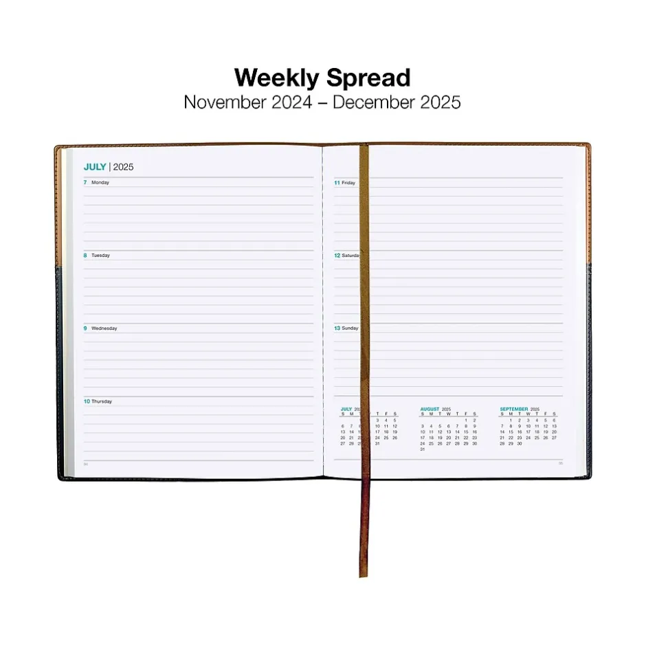 Organize your life with this Global Printed Products 2025 weekly and monthly planner. Weekly spreads have ruled days to record tasks or reminders, and monthly spreads are ruled for neat scheduling. The planner covers a 14-month date range from November 2024 to December 2025.