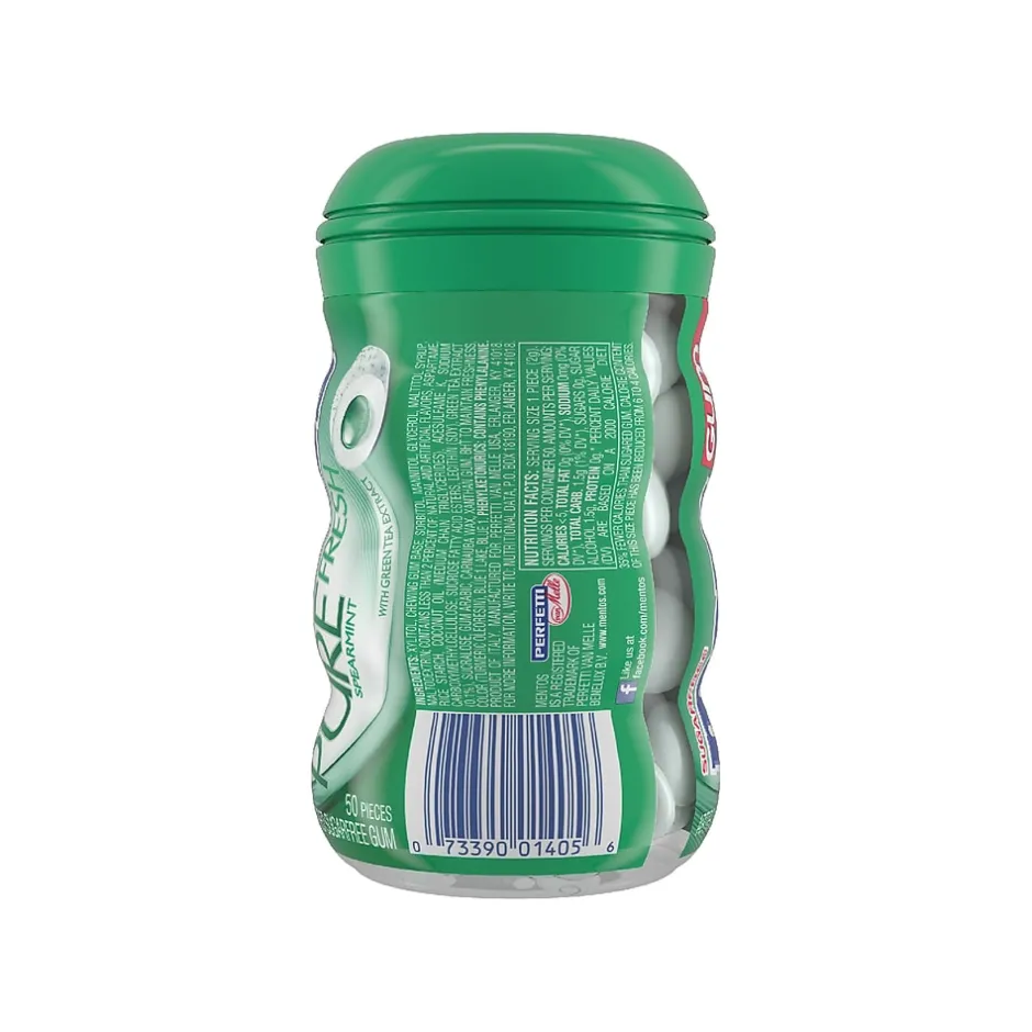 Savor the minty taste of this spearmint gum. Mint extracts burst in your mouth at the very first bite. A convenient pack keeps these 50 pieces of Mentos Pure Fresh spearmint gum tightly sealed for storage at your desk or in a cabinet.