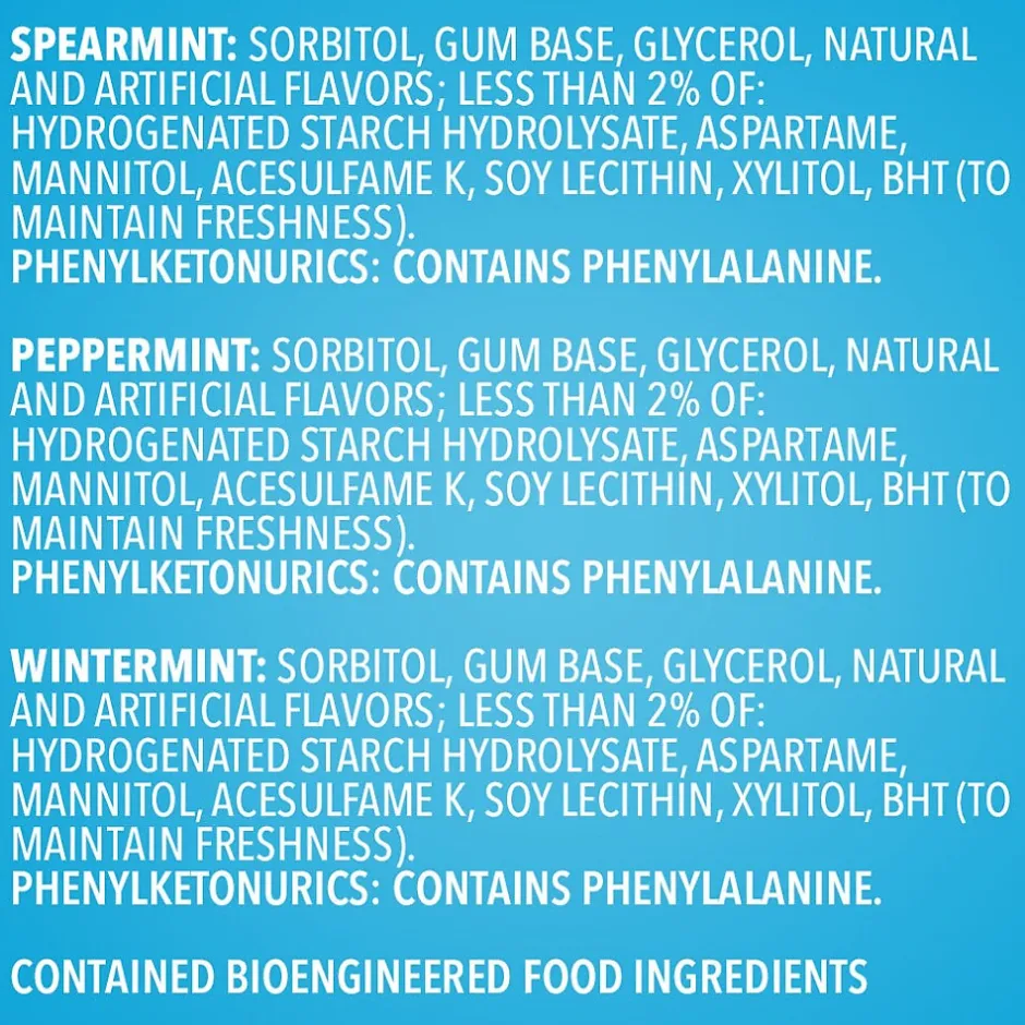 - Spearmint, peppermint, and wintermint flavored chewing gum