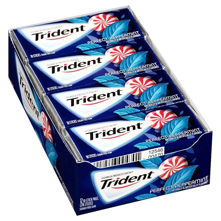 Freshen your breath with the refreshing minty flavor of this Trident Perfect Peppermint Gum. This 12-Pack has more than enough cooling and sweet gum packs to keep in your car, pocketbook, desk drawer, or at home. Grab a pack of this Sugar-Free Trident Perfect Peppermint Gum and chew the gum that’s bursting with delicious mint flavor. Clean and freshen your break with this great tasting gum!