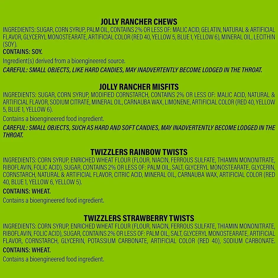 - Contains Jolly Rancher chews candy, Jolly Rancher misfits gummies, Twizzlers rainbow twists chewy candy and Twizzlers twists strawberry-flavored chewy candy.