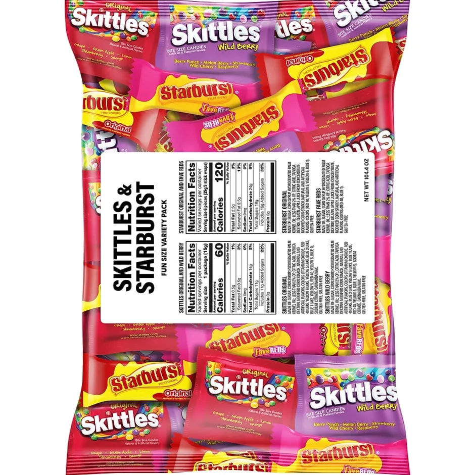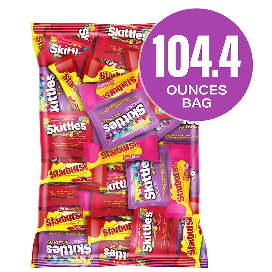 - Contains one (1) 104.4-ounce bulk bag filled fun size SKITTLES and STARBURST Chewy Candy packs