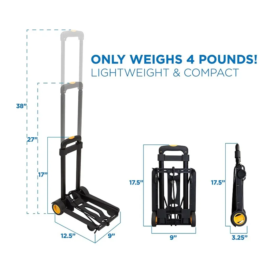 - Lightweight and Foldable: This Folding hand truck folds up to a manageable size great for storage and portability. Its lightweight, weighing only 4lbs and measures 17.5” x 9” when folded.