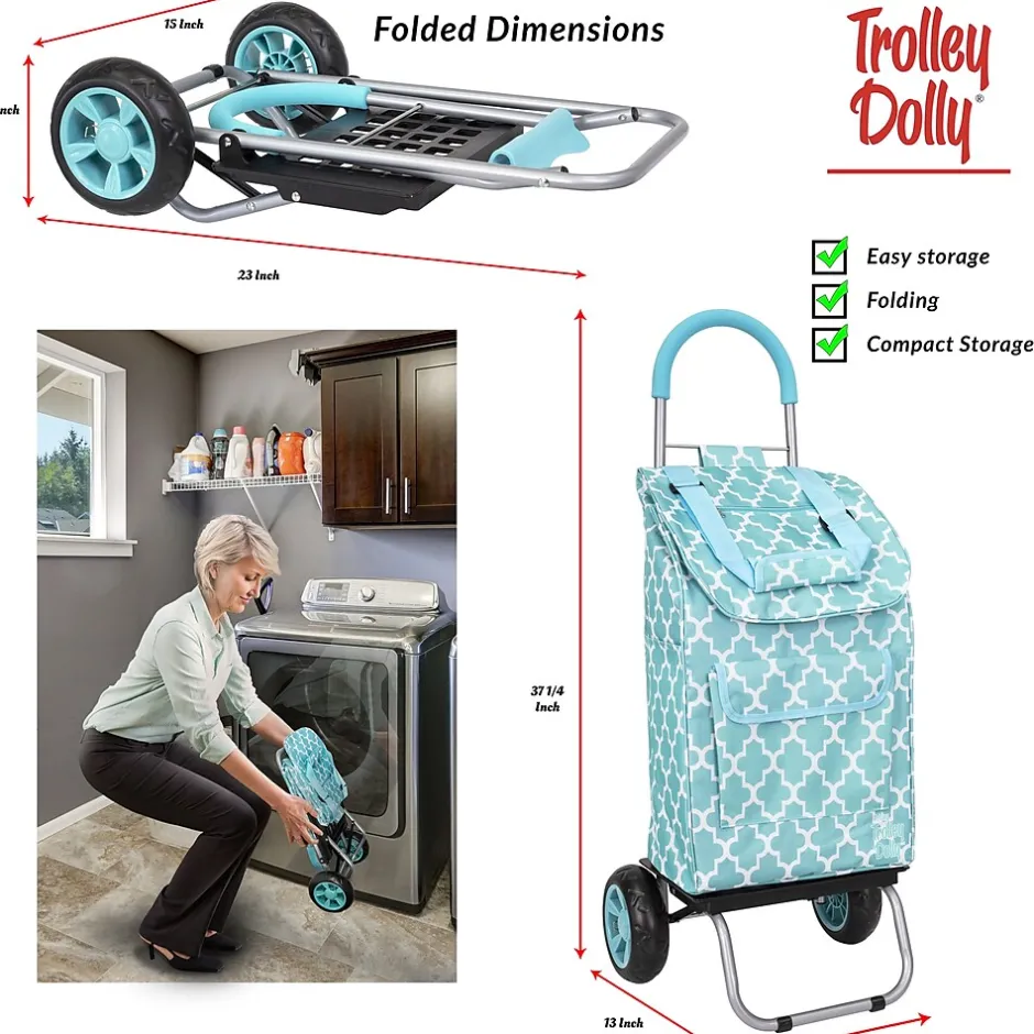 The folding Trolley dolly folds in 1/2 for compact storage. It has a comfort cushion handle that allows you to pull it anywhere. The folding Trolley dolly is designed with 7 compartments/pockets including a beverage holder. The oversized beefy wheels allow for smooth rolling on any surface including cobblestones, sand, stairs or any uneven surfaces. Carry everything from utilities, small groceries, and laundry with this lightweight wheeled push handcart.
